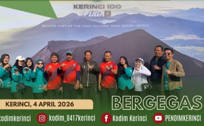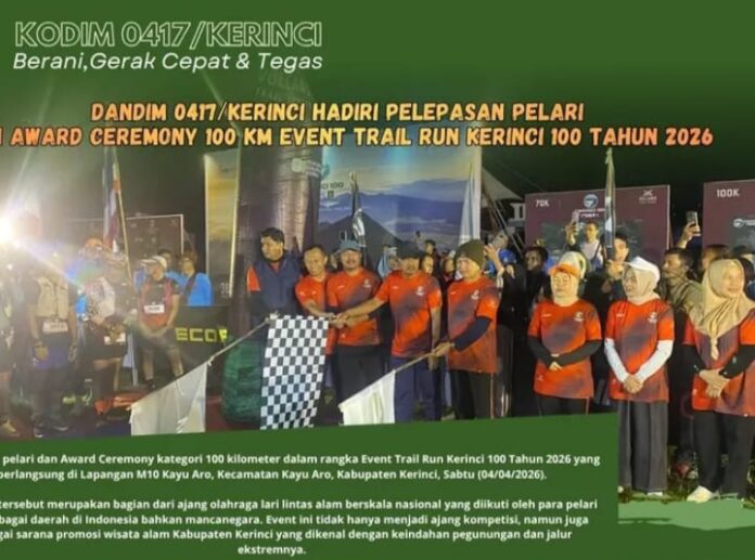 KERINCI, ASPIRASITERKINI.COM – Komandan Kodim (Dandim) 0417/Kerinci Letkol Inf Eko Siswanto, S.Hub.Int.,M.I.P. menghadiri kegiatan undangan acara pelepasan pelari dan Award Ceremony kategori 100 kilometer dalam rangka Event Trail Run Kerinci 100 Tahun 2026 yang berlangsung di Lapangan M10 Kayu Aro, Kecamatan Kayu Aro, Kabupaten Kerinci , Sabtu 4 April 2026.