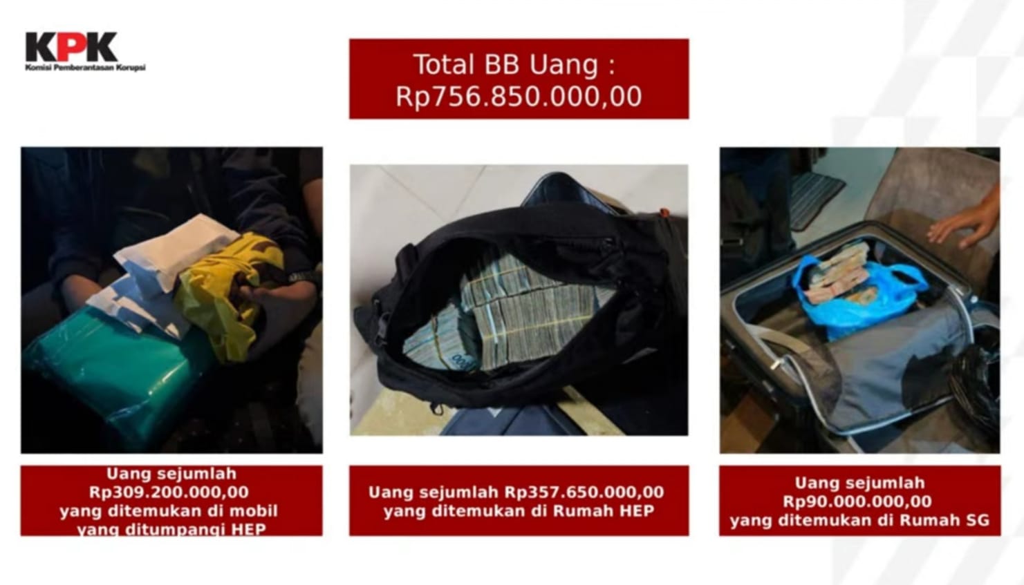 Adapun rincian uang yang diduga diserahkan Penyidik KPK setelah penyerahan uang awal (ijon proyek) dari tiga kontraktor dengan total sekitar Rp756,8 juta. Dengan rincian Rp330 juta dari kontraktor EM terkait proyek pembangunan pedestrian, drainase dan sport center senilai sekitar Rp9,8 miliar. Rp400 juta dari IRS terkait proyek pembangunan jalan senilai sekitar Rp3 miliar. Rp250 juta dari YK terkait proyek penataan kawasan stadion sepak bola senilai sekitar Rp11 miliar. Uang tersebut diduga diserahkan melalui beberapa perantara dari kalangan aparatur sipil negara di lingkungan dinas terkait. (JP)